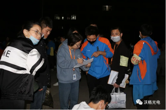下班后的白班人员们快速响应做好驻厂准备,列队领取物资。